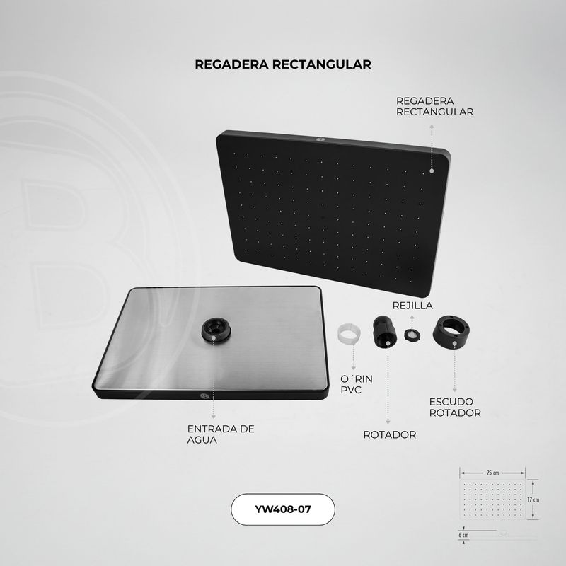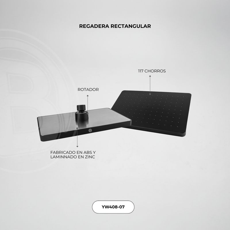 REGADERA RECTANGULAR. 117 CHORROS DE SALIDA DE AGUA. FABRICADA EN ABS LAMINA EN ZINC COLOR NEGRO. MEDIDAS: ALTO: 6 cm ANCHO: 25 cm LARGO: 17 cm